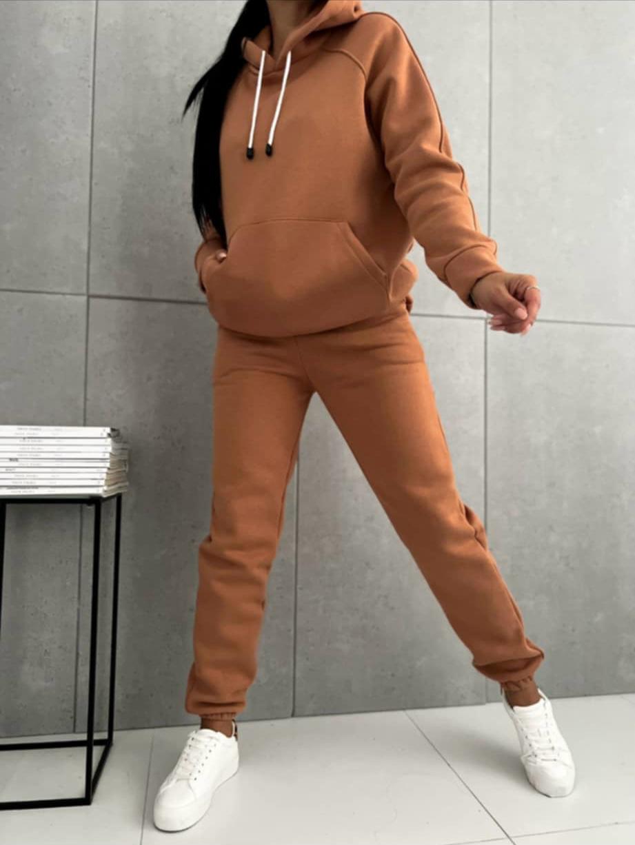 Dres składa się z luźnej bluzy i dopasowanych spodni, co tworzy harmonijną całość, idealną na jesień i zimę. Modny odcień brązowy dodaje stylizacji charakteru, podkreślając Twoją indywidualność. Elastyczne ściągacze gwarantują wygodne dopasowanie, a ocieplane wnętrze sprawia, że zestaw jest niezastąpiony w chłodne dni.